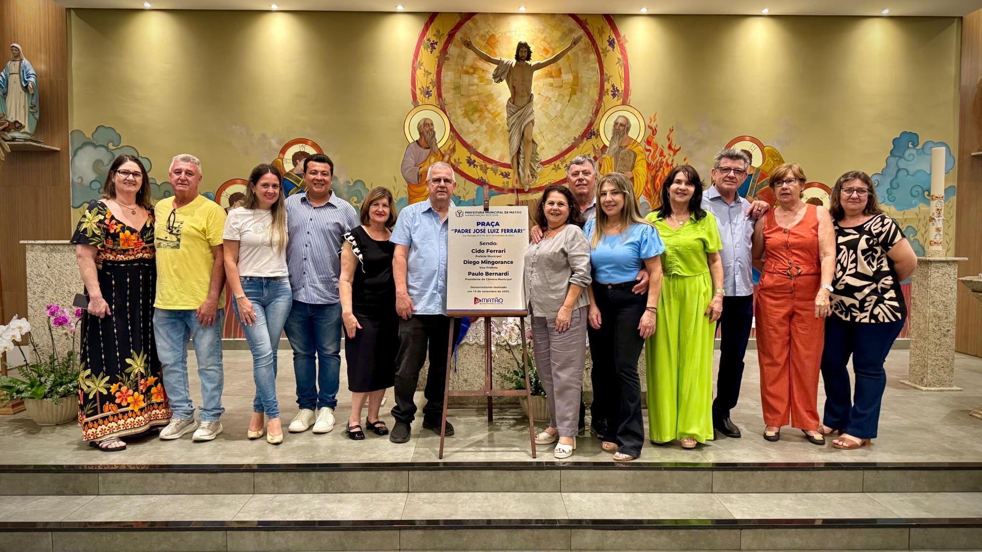 Logo após a missa, a emoção se estendeu para a frente da igreja, onde aconteceu a cerimônia de descerramento da placa que oficializou a denominação da Praça Padre José Luiz Ferrari. O espaço, que agora leva seu nome, está situado em frente à Igreja de São Sebastião.