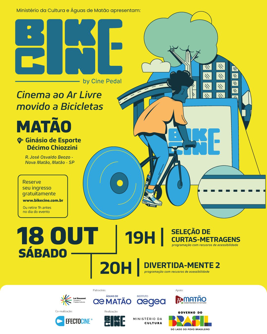 O BikeCine em Matão é viabilizado pela Lei Rouanet, com patrocínio da Águas de Matão e Instituto Aegea, apoio da Prefeitura de Matão, e realização do BikeCine, Ministério da Cultura e Governo Federal, sempre ao lado do povo brasileiro.